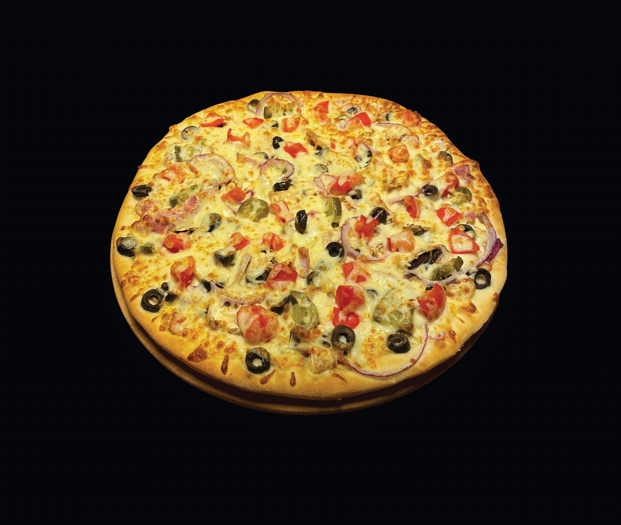 Индейка, Курица копченная, Ветчина говяжья, Шампиньоны, помидор, халапеньо, красный лук, маслины, соус острый
