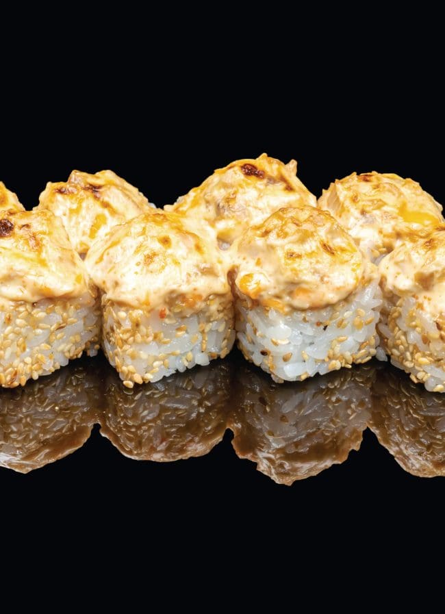 Рис, нори, сыр сливочный, лосось жареный, курица, кунжут белый, соус фирменный. 8шт