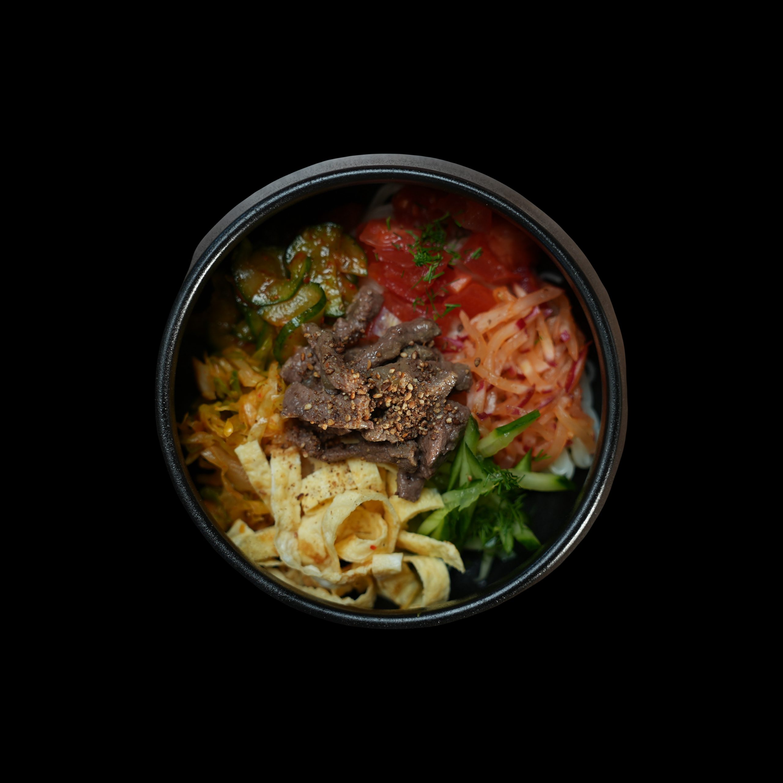 Говядина, грибы Эноки, Яичная лапша, яйцо, огурцы, лук зелённый, масло кунжутное, кунжут