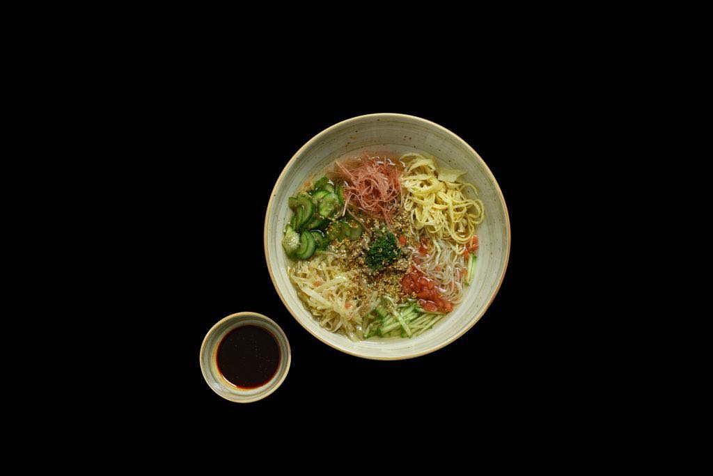Рисовая лапша, креветки, угорь, лосось, лук зелёный, кунжут, вакамэ