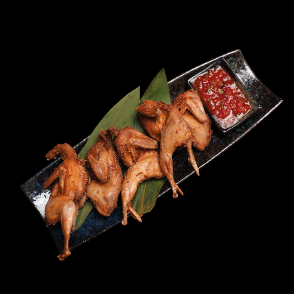 Куриное бедро, темпура, красный лук, зеленый лук, лук порей, репчатый лук, чеснок, перец Чилли, кинза, остро-сладкий соус